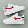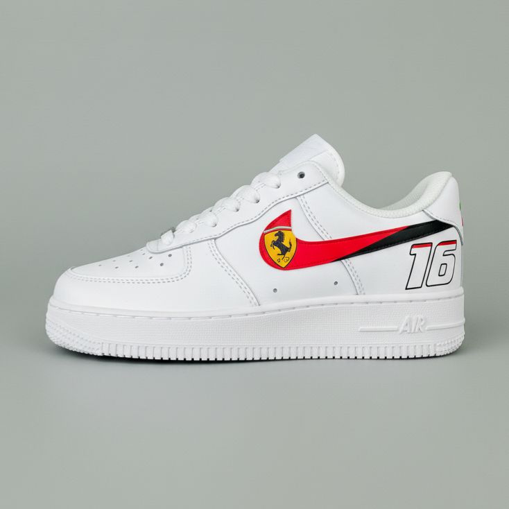 Custom Nike Air Force 1 sneakers inspired by Ferrari racing cars. Featuring red and black details with a premium hand-painted finish. Perfect sneakers for Ferrari fans, car lovers, and sneaker collectors.
